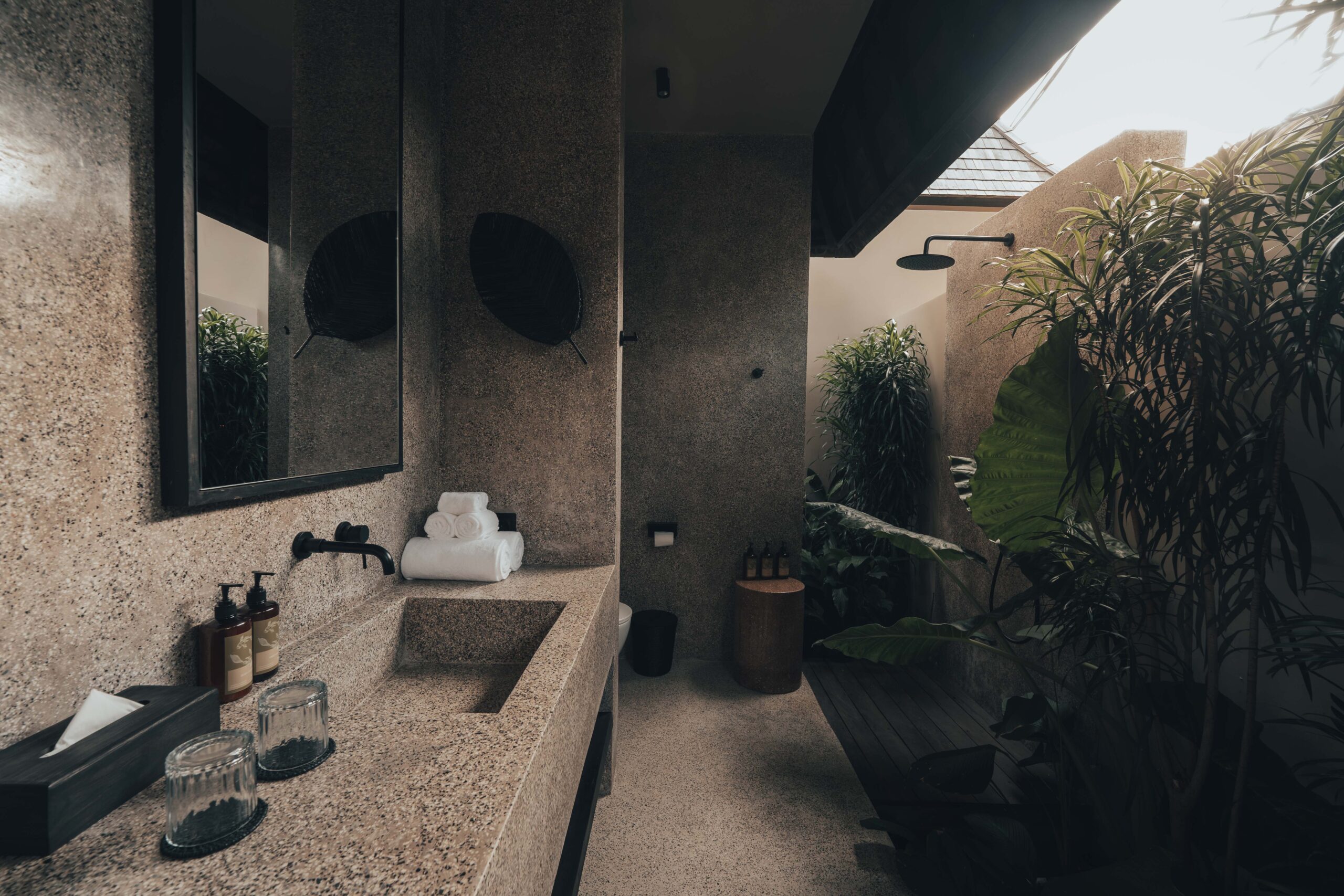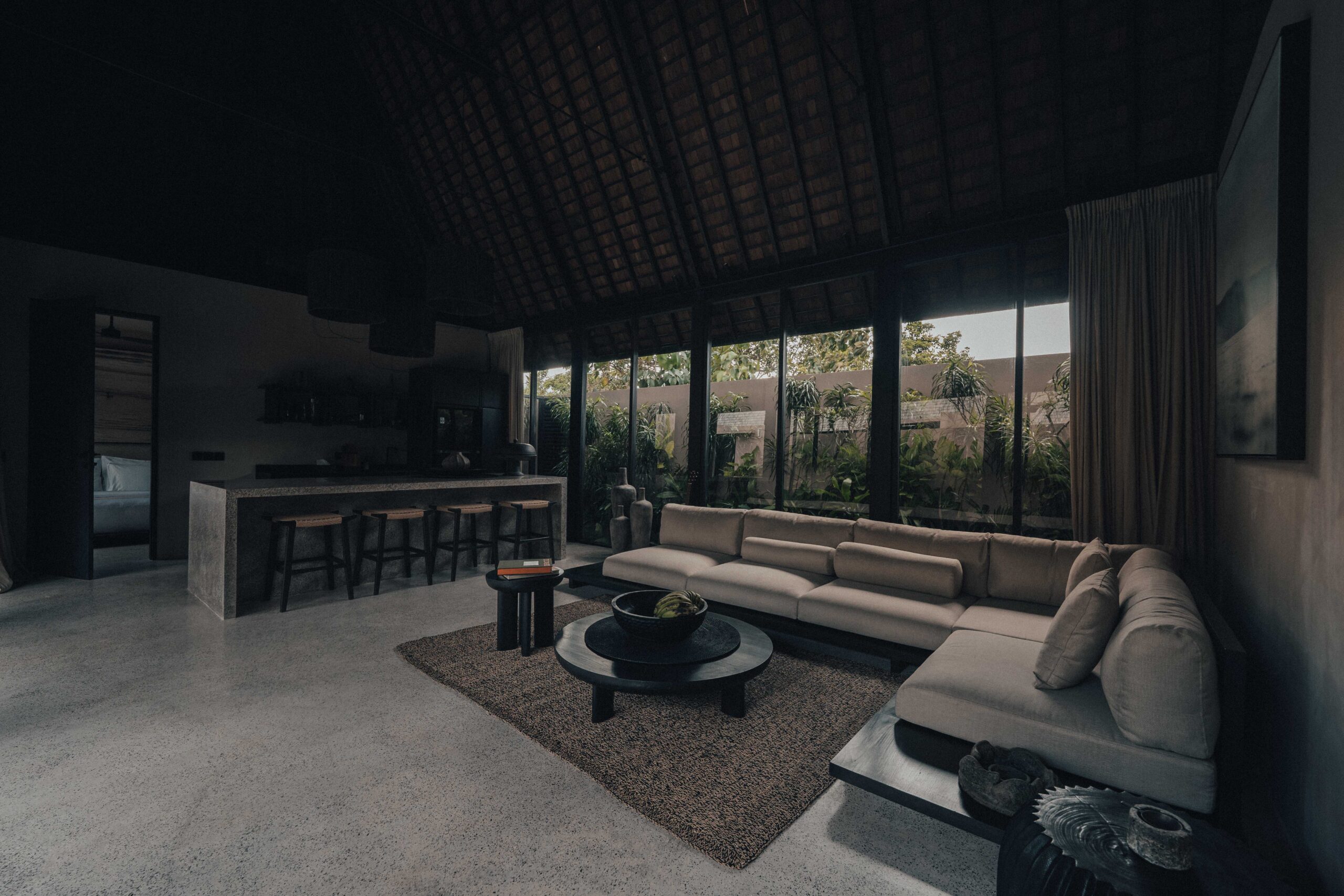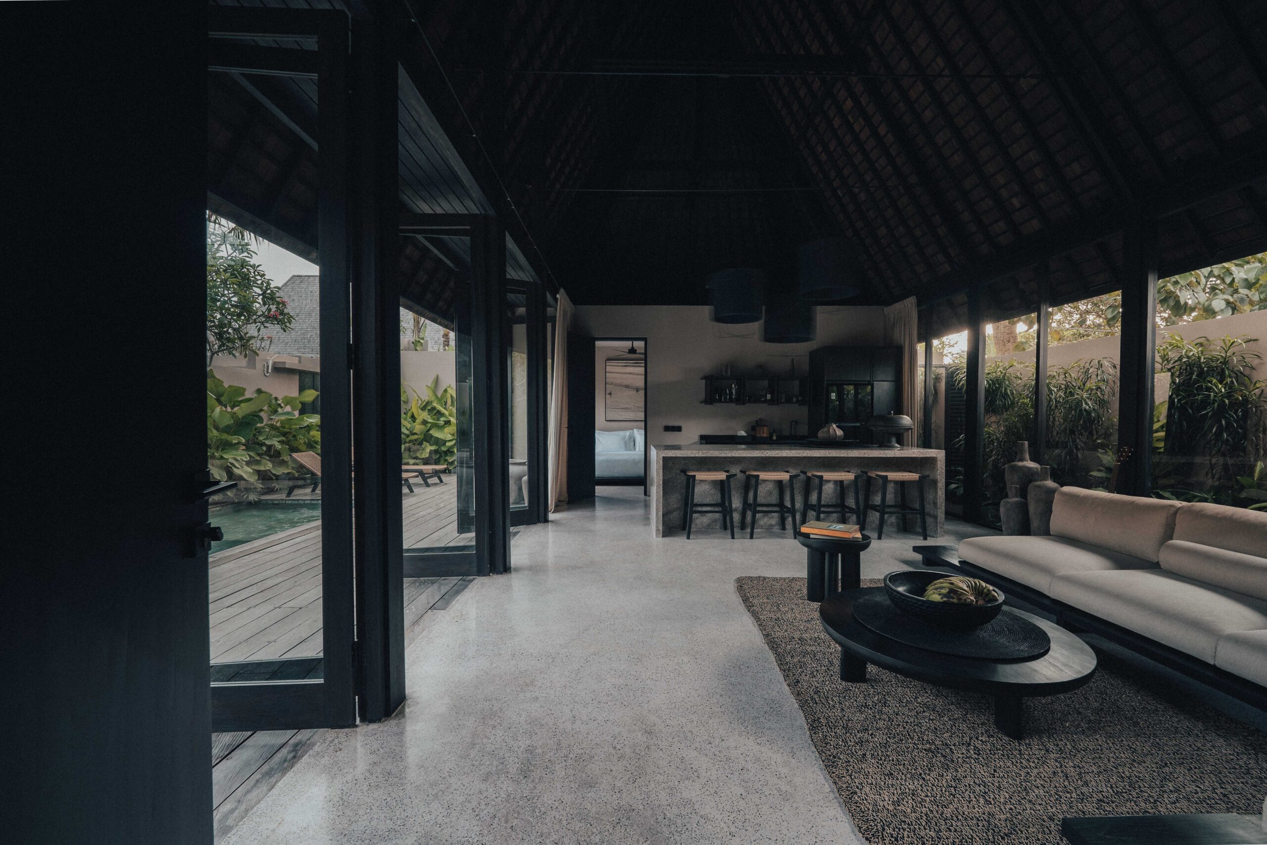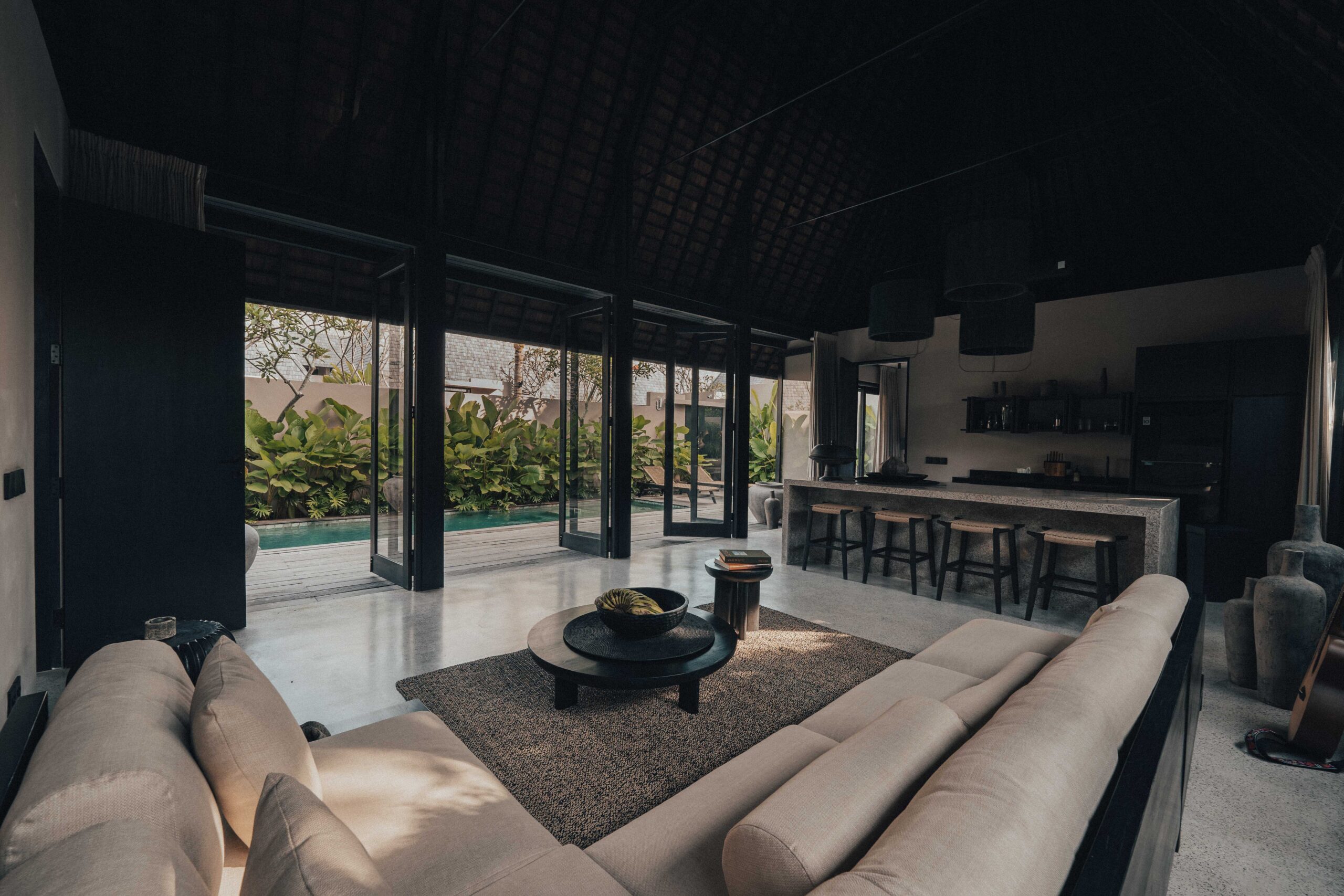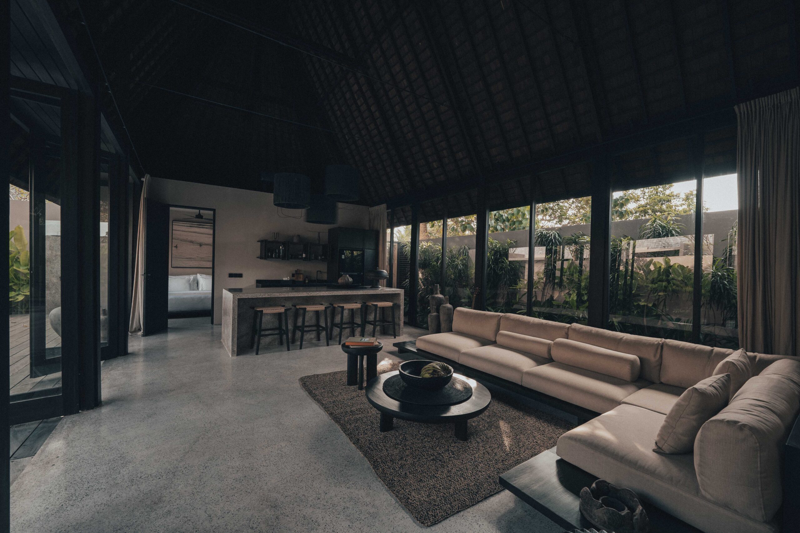 The One Bedroom Villa is designed for a slower, more self-contained stay. An open living area flows into a fully equipped kitchen, creating space for mornings that start unhurried and evenings that settle naturally. The bedroom connects to a semi-indoor bathroom filled with greenery and natural daylight, keeping the boundary between inside and outside soft and unforced. Outdoors, a private pool, sun loungers, and a shaded umbrella offer a quiet place to rest, read, or let the day pass — without needing to leave the villa at all.