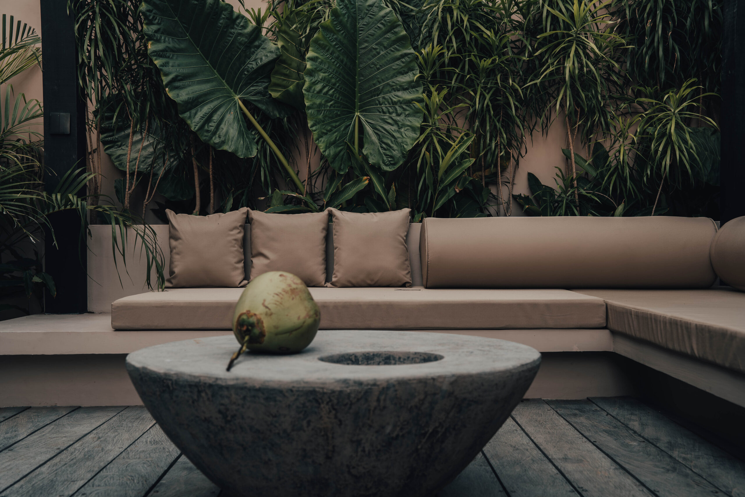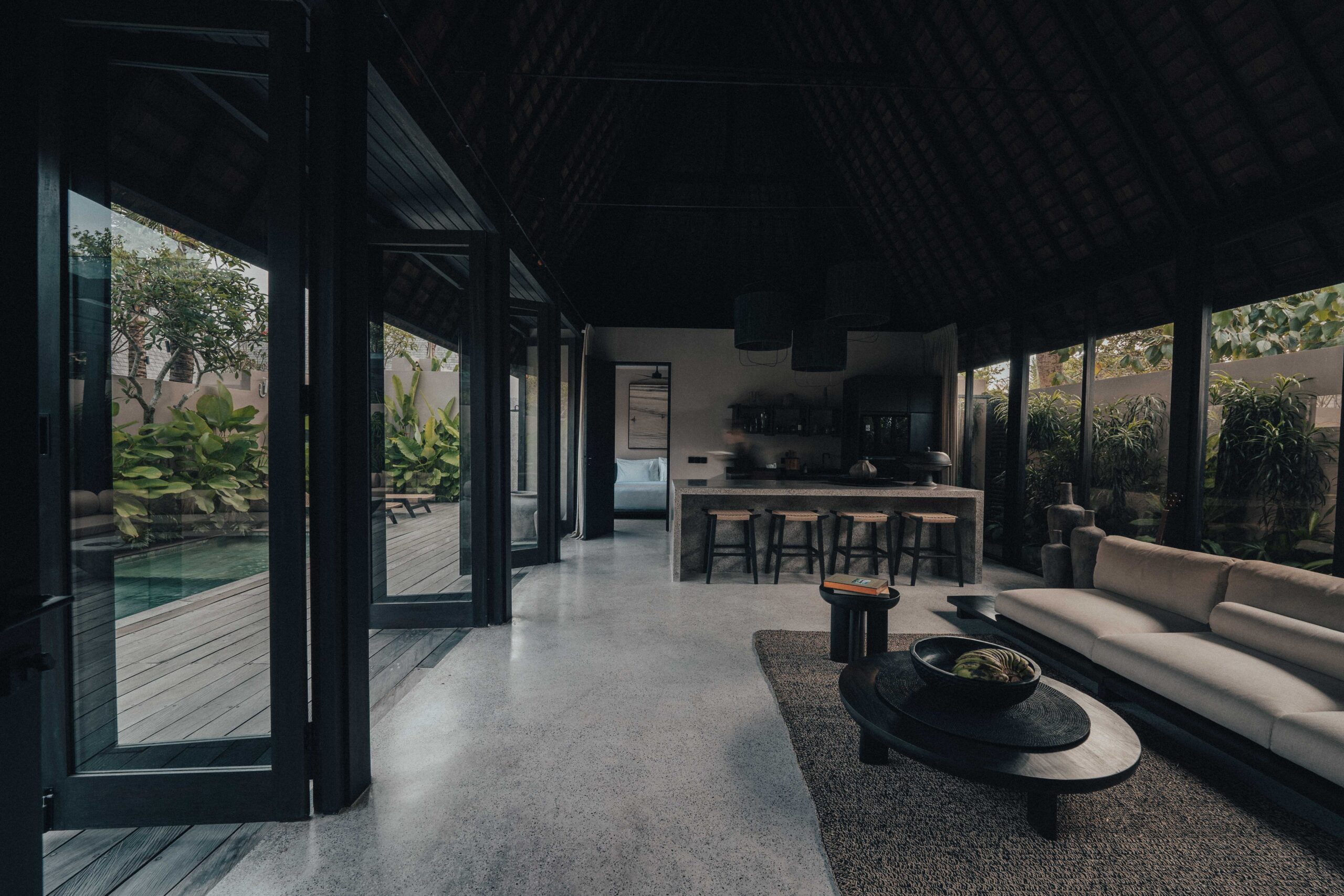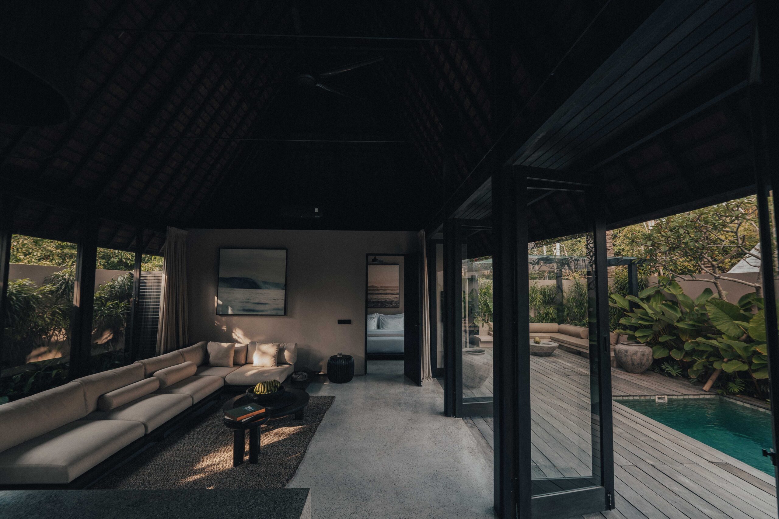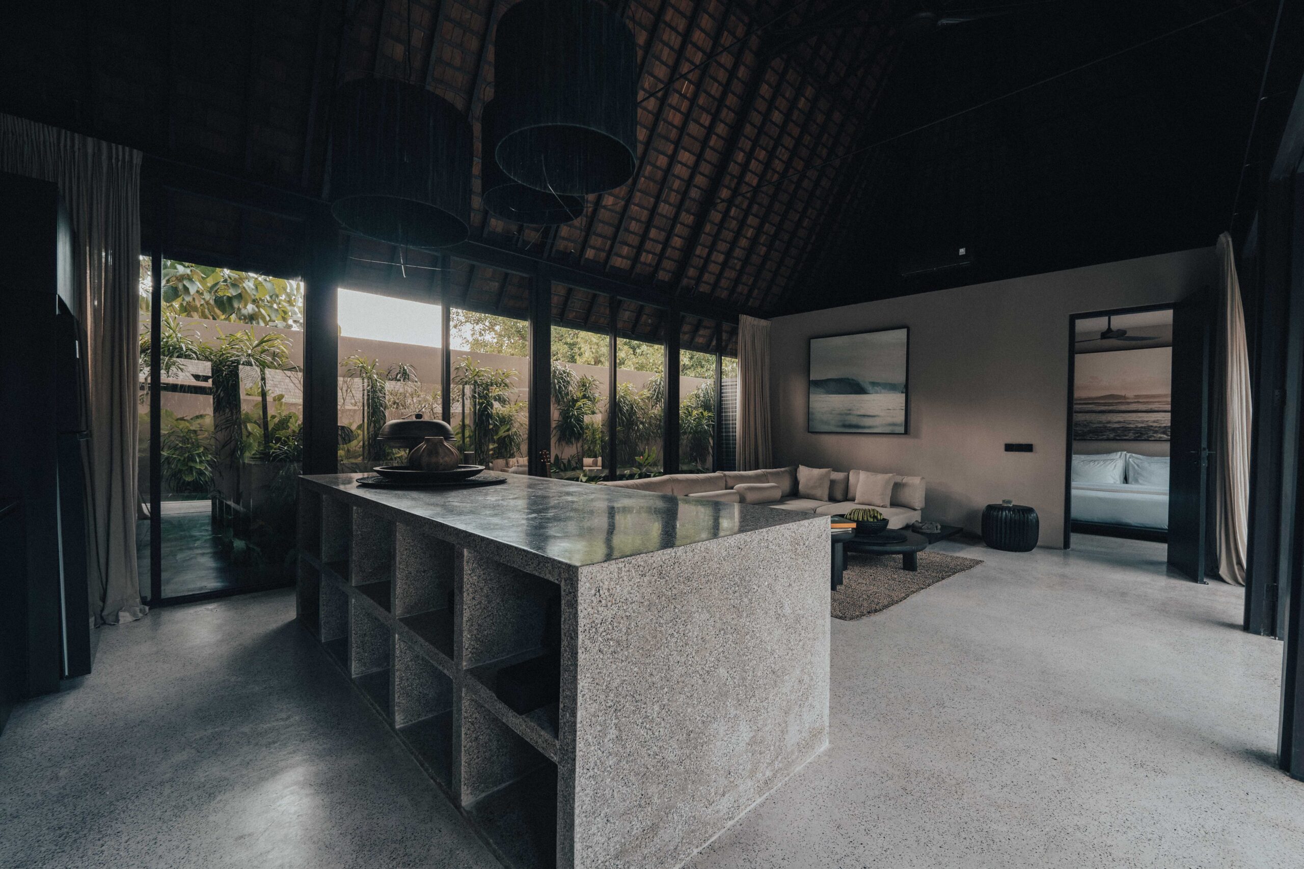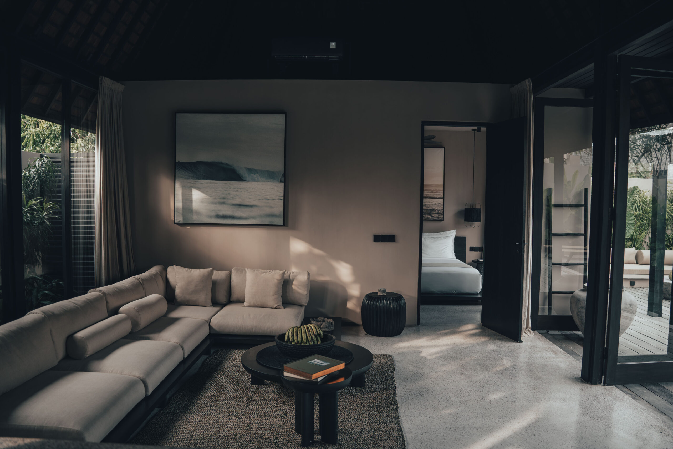 The One Bedroom Villa is designed for a slower, more self-contained stay. An open living area flows into a fully equipped kitchen, creating space for mornings that start unhurried and evenings that settle naturally. The bedroom connects to a semi-indoor bathroom filled with greenery and natural daylight, keeping the boundary between inside and outside soft and unforced. Outdoors, a private pool, sun loungers, and a shaded umbrella offer a quiet place to rest, read, or let the day pass — without needing to leave the villa at all.