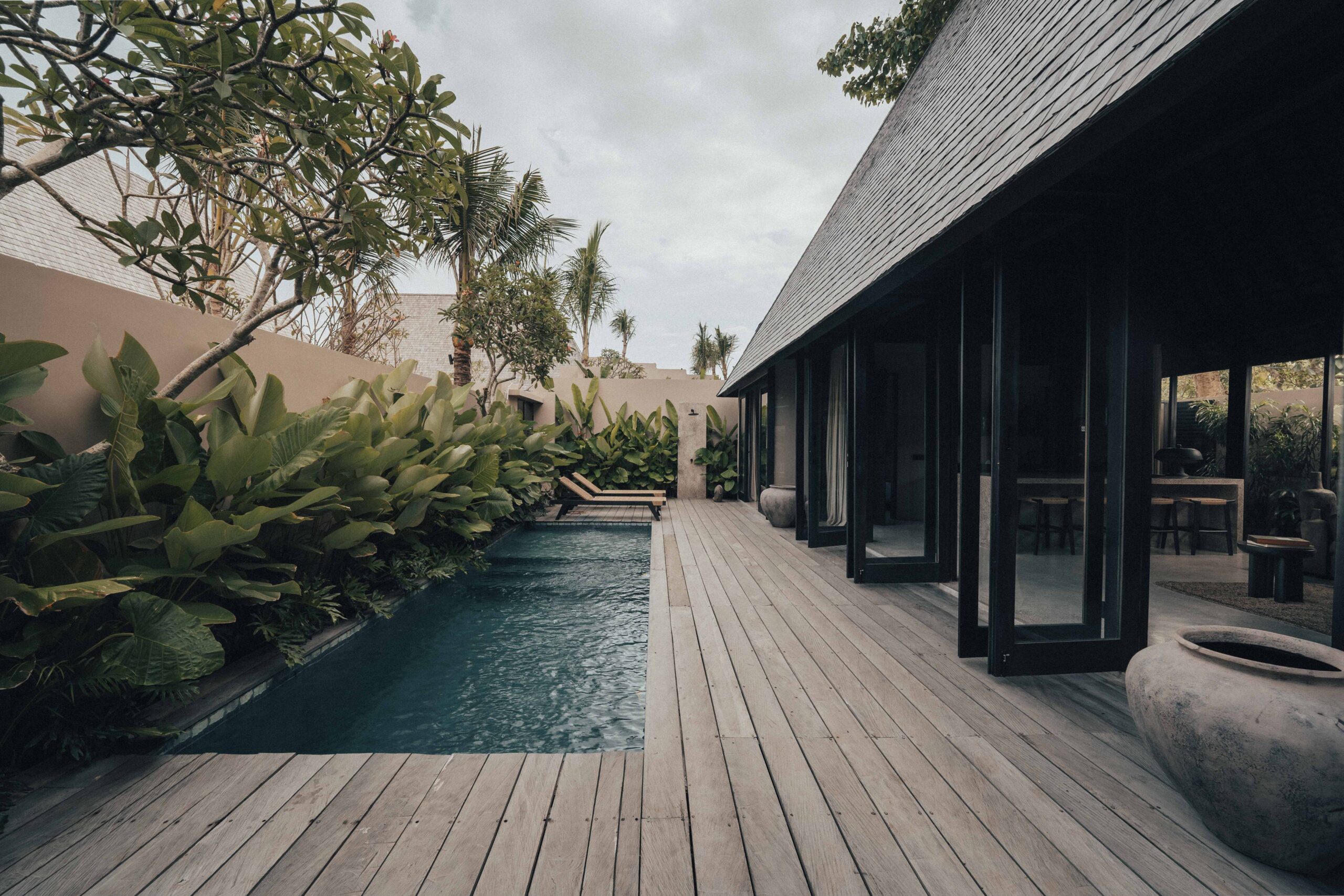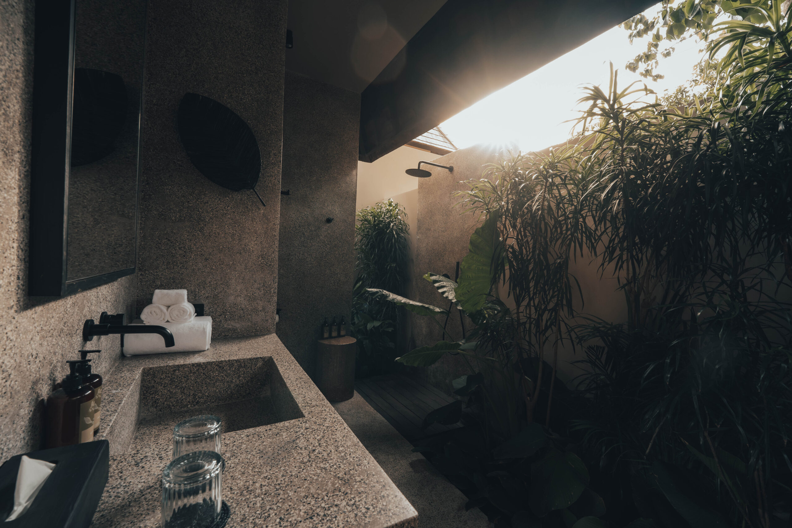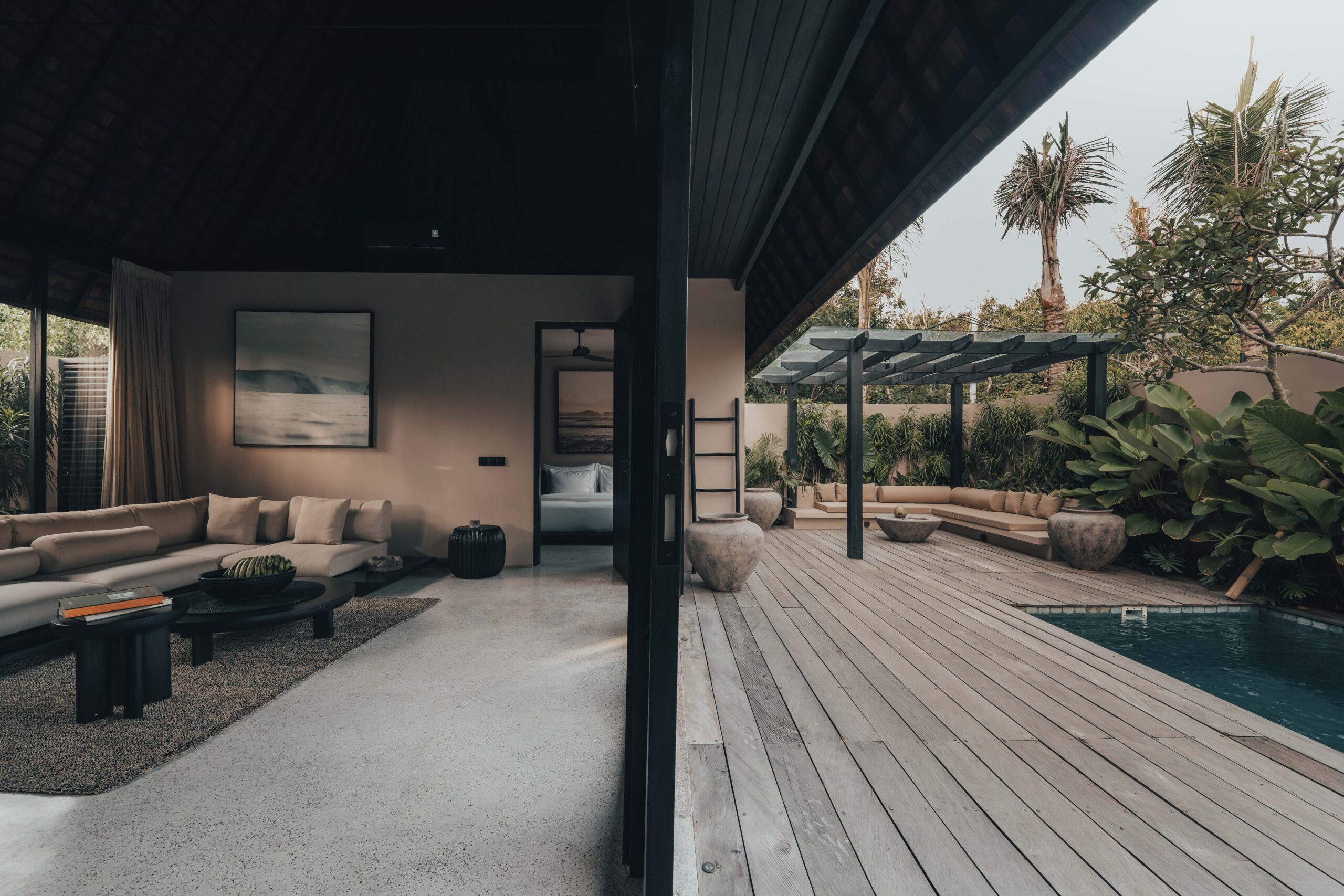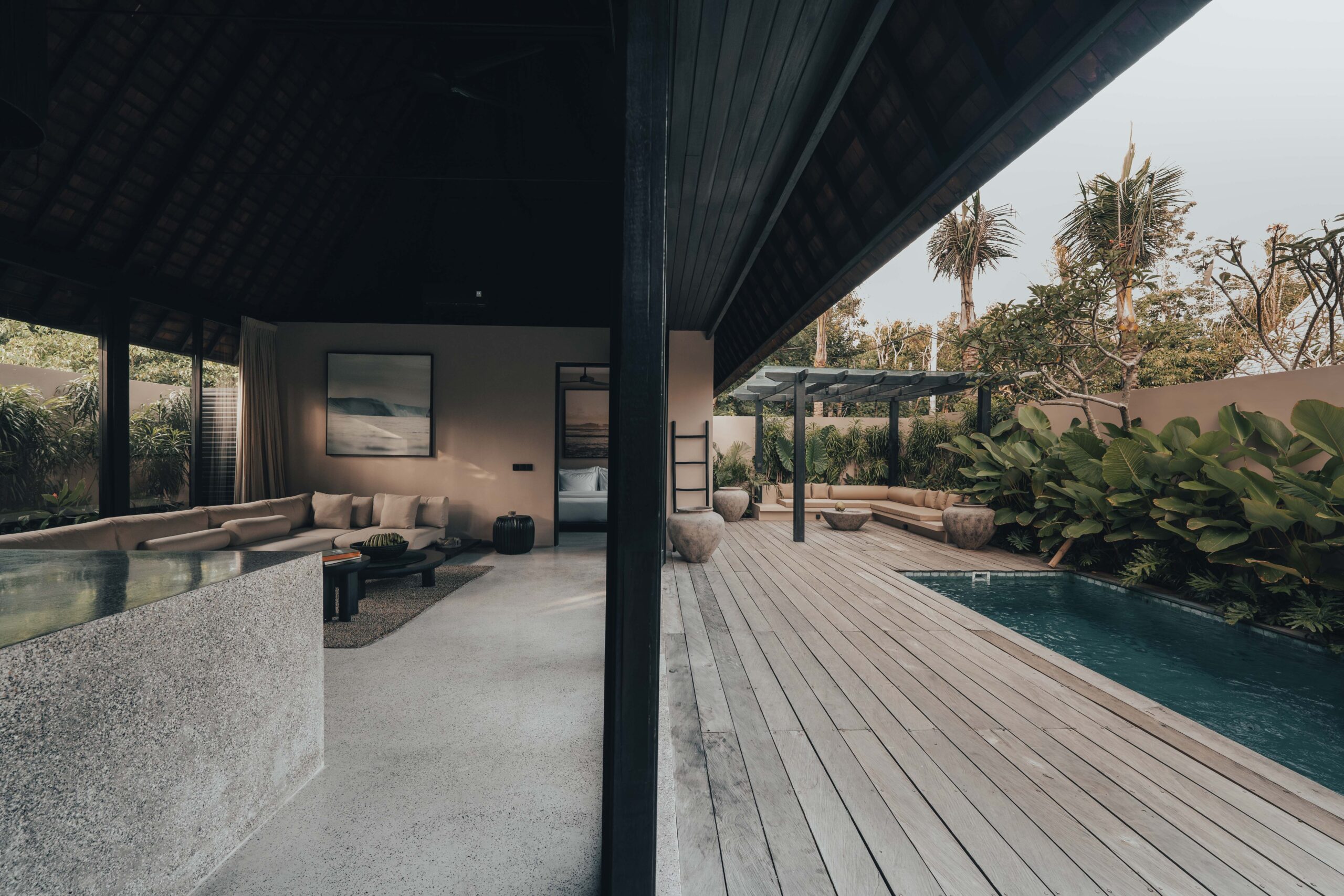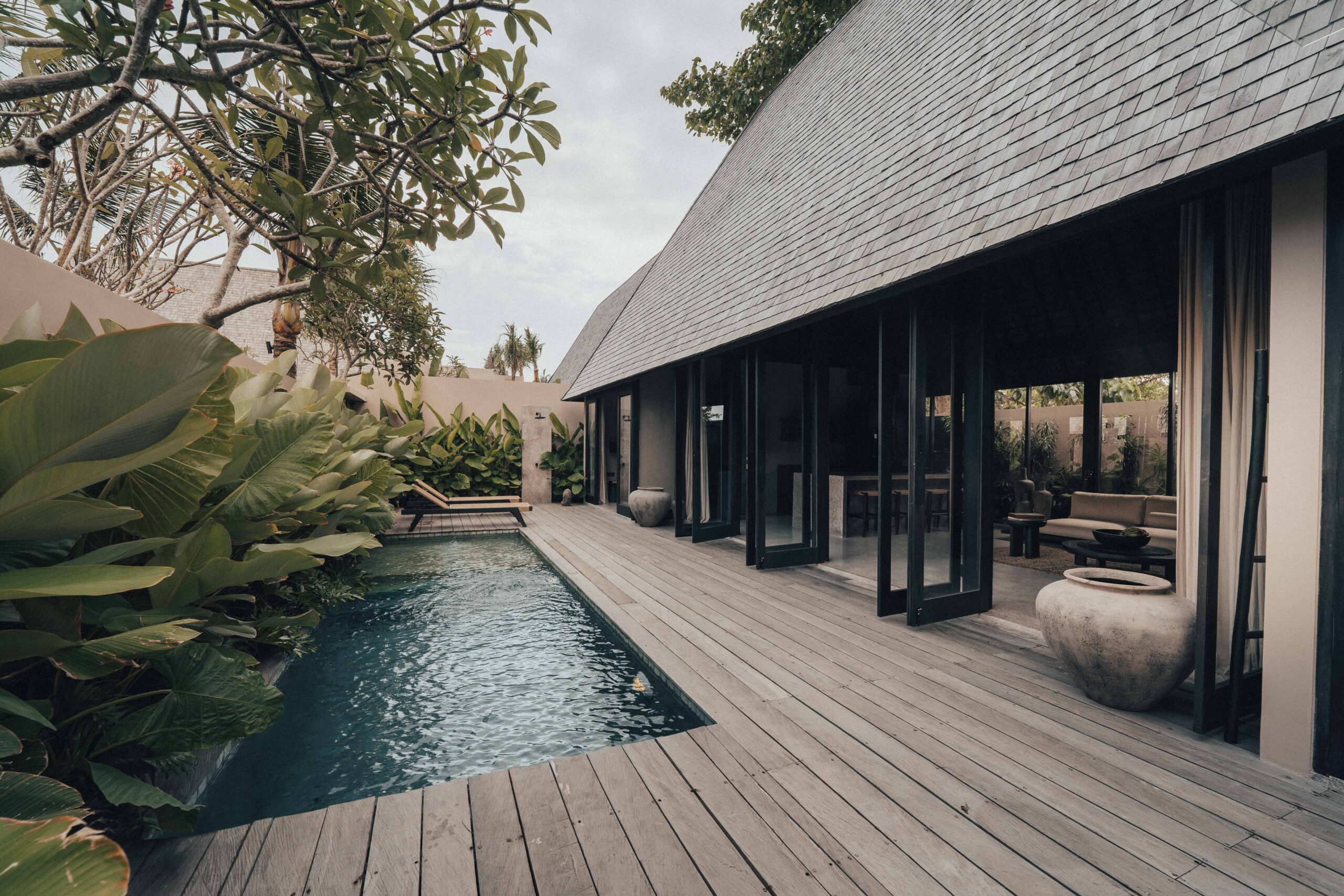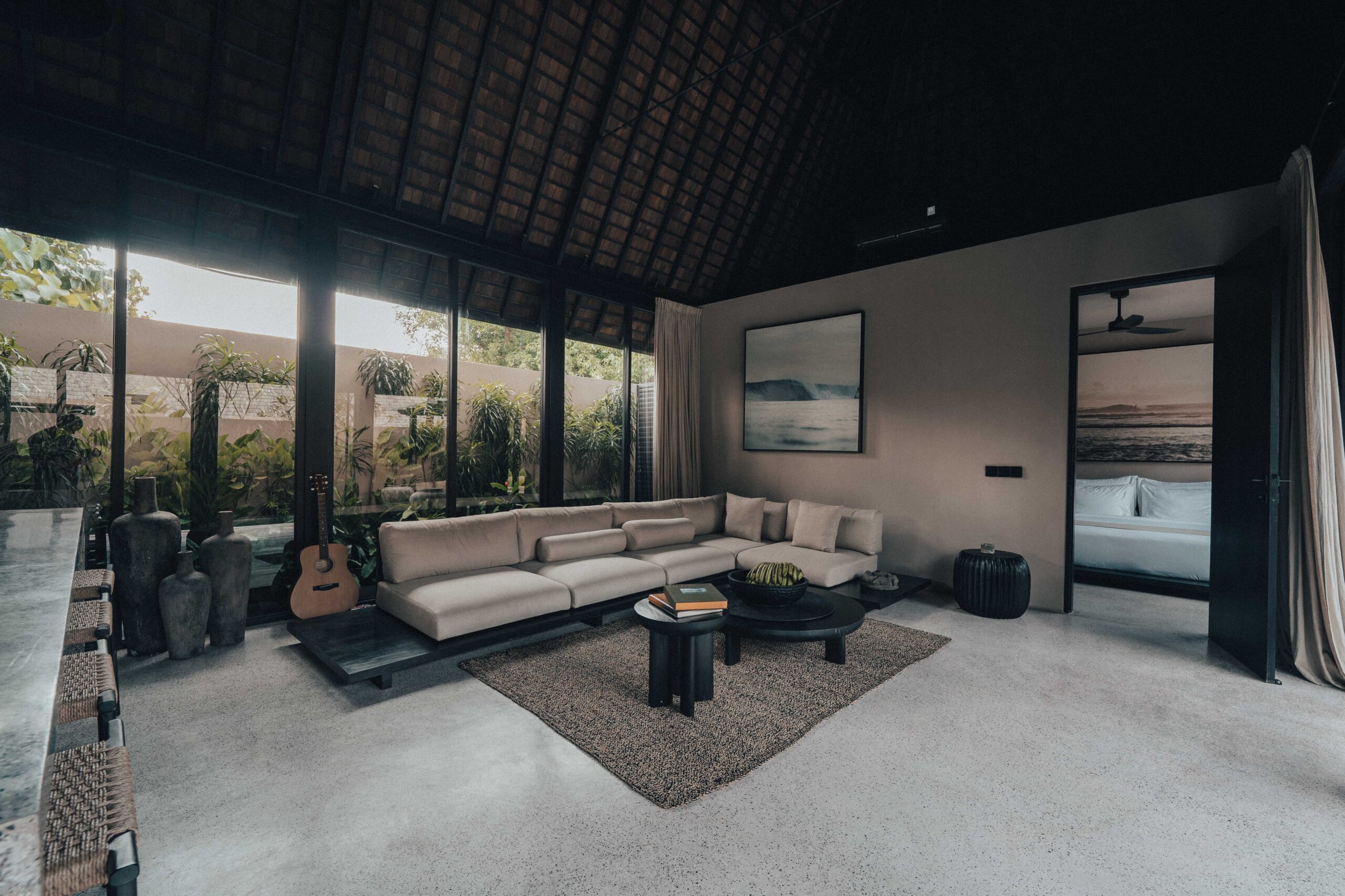 The One Bedroom Villa is designed for a slower, more self-contained stay. An open living area flows into a fully equipped kitchen, creating space for mornings that start unhurried and evenings that settle naturally. The bedroom connects to a semi-indoor bathroom filled with greenery and natural daylight, keeping the boundary between inside and outside soft and unforced. Outdoors, a private pool, sun loungers, and a shaded umbrella offer a quiet place to rest, read, or let the day pass — without needing to leave the villa at all.