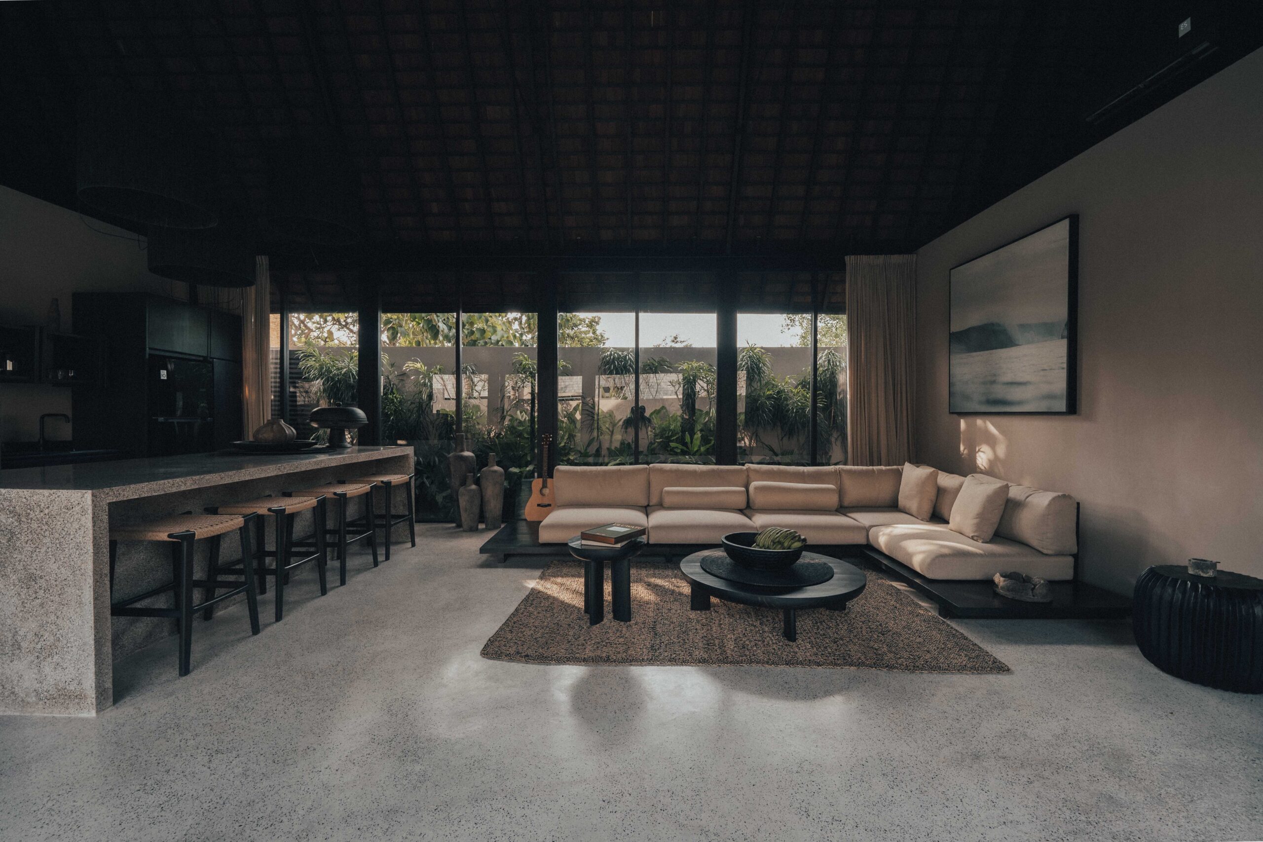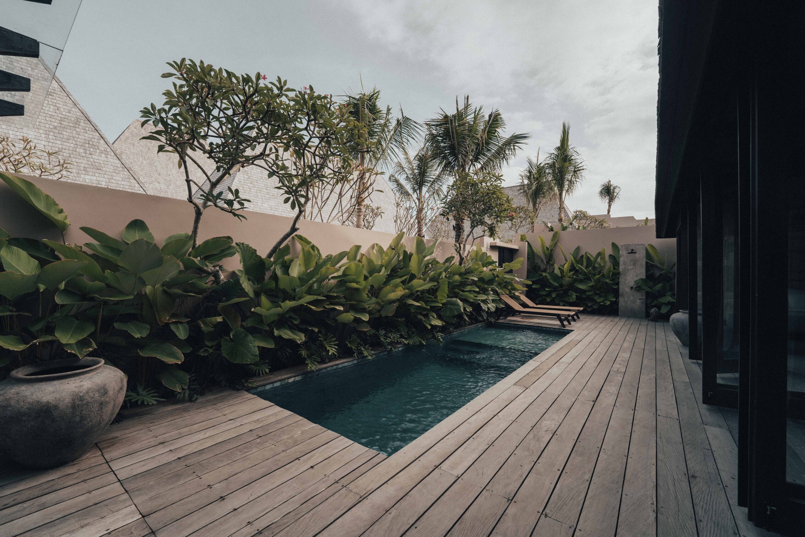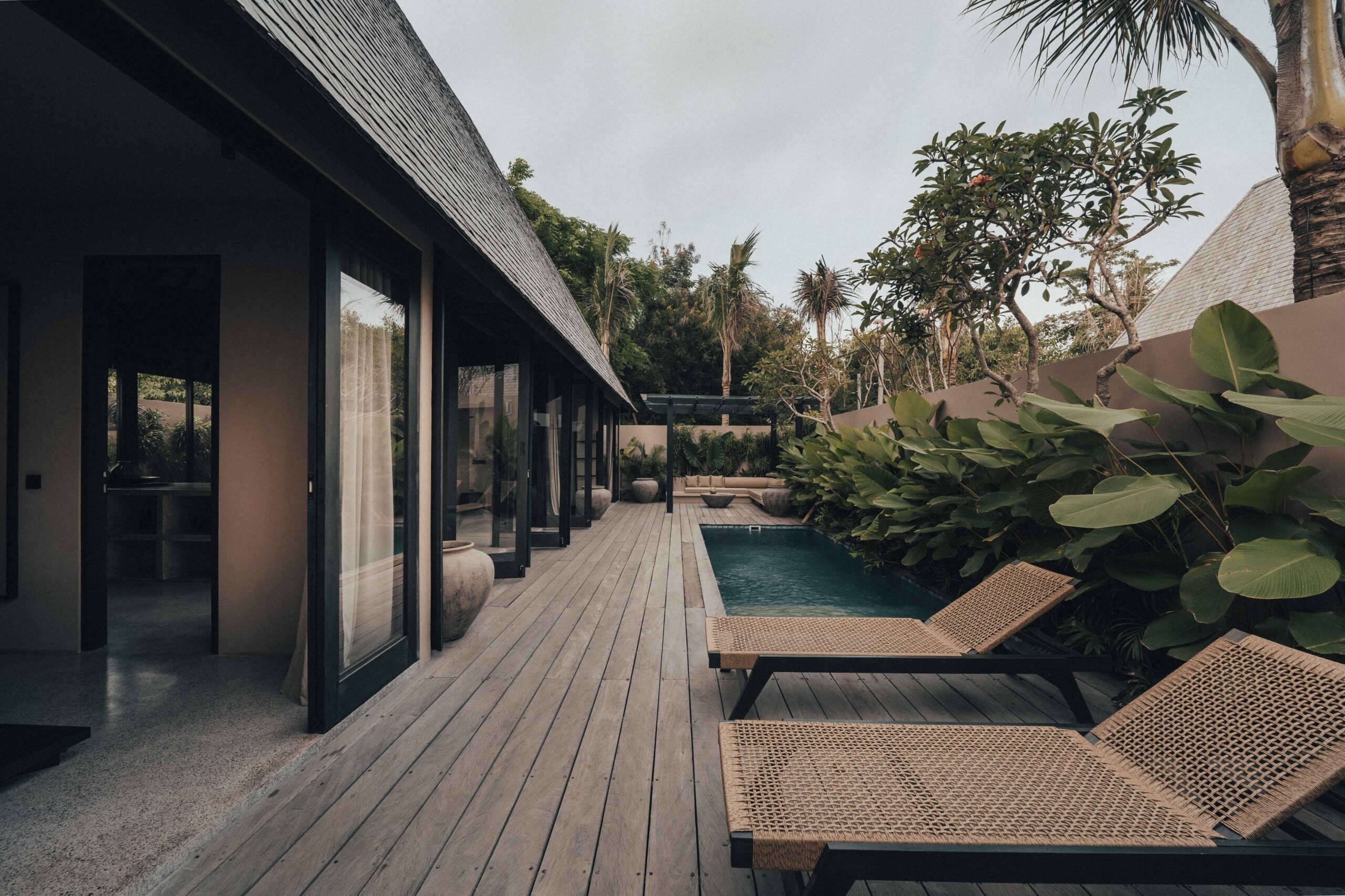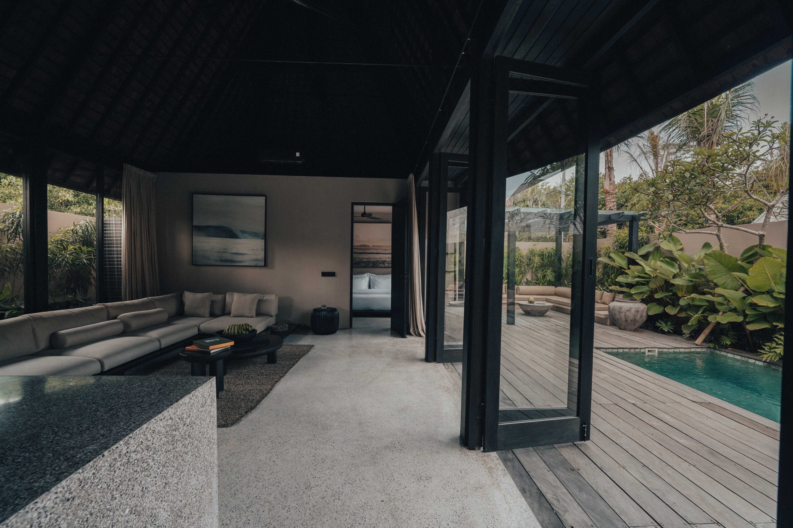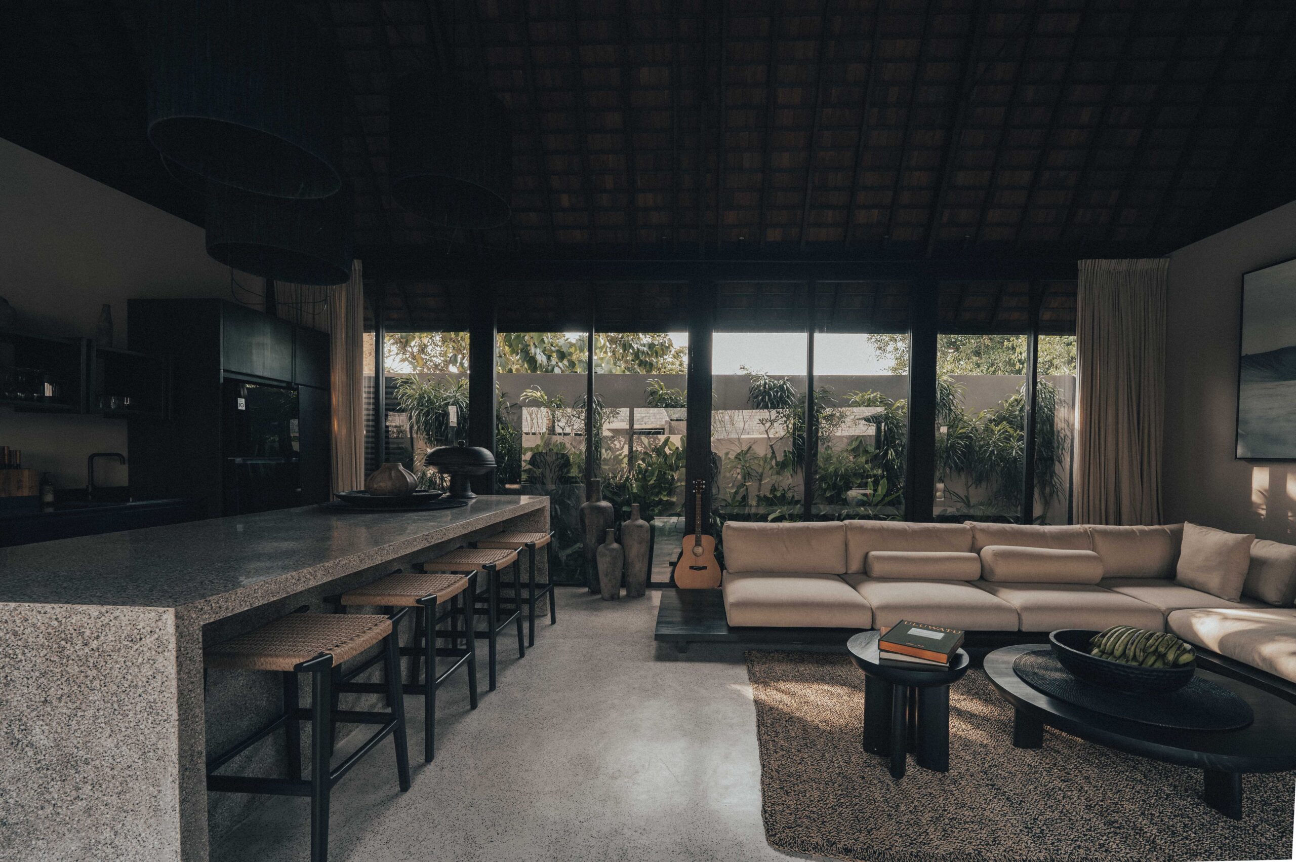 The One Bedroom Villa is designed for a slower, more self-contained stay. An open living area flows into a fully equipped kitchen, creating space for mornings that start unhurried and evenings that settle naturally. The bedroom connects to a semi-indoor bathroom filled with greenery and natural daylight, keeping the boundary between inside and outside soft and unforced. Outdoors, a private pool, sun loungers, and a shaded umbrella offer a quiet place to rest, read, or let the day pass — without needing to leave the villa at all.