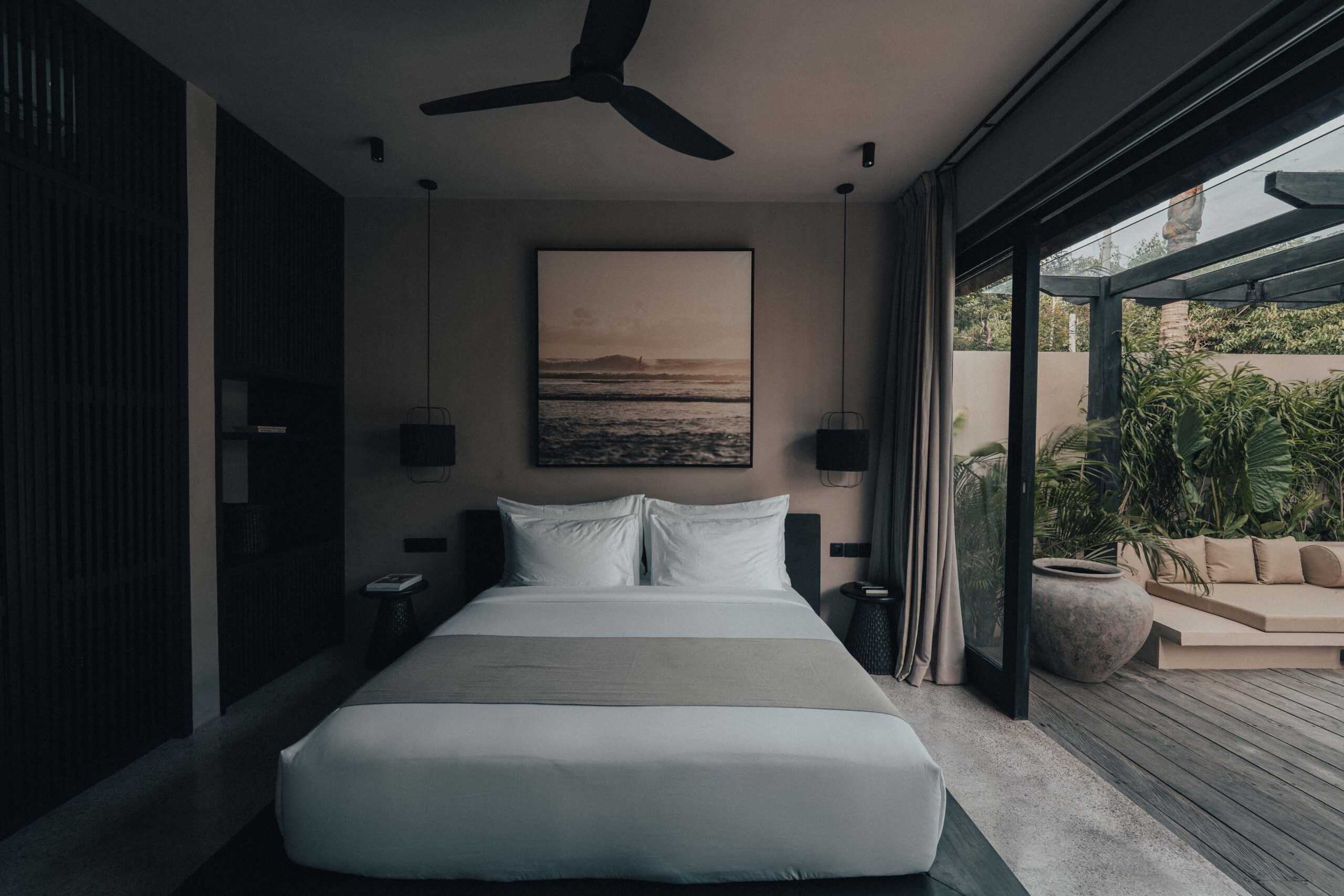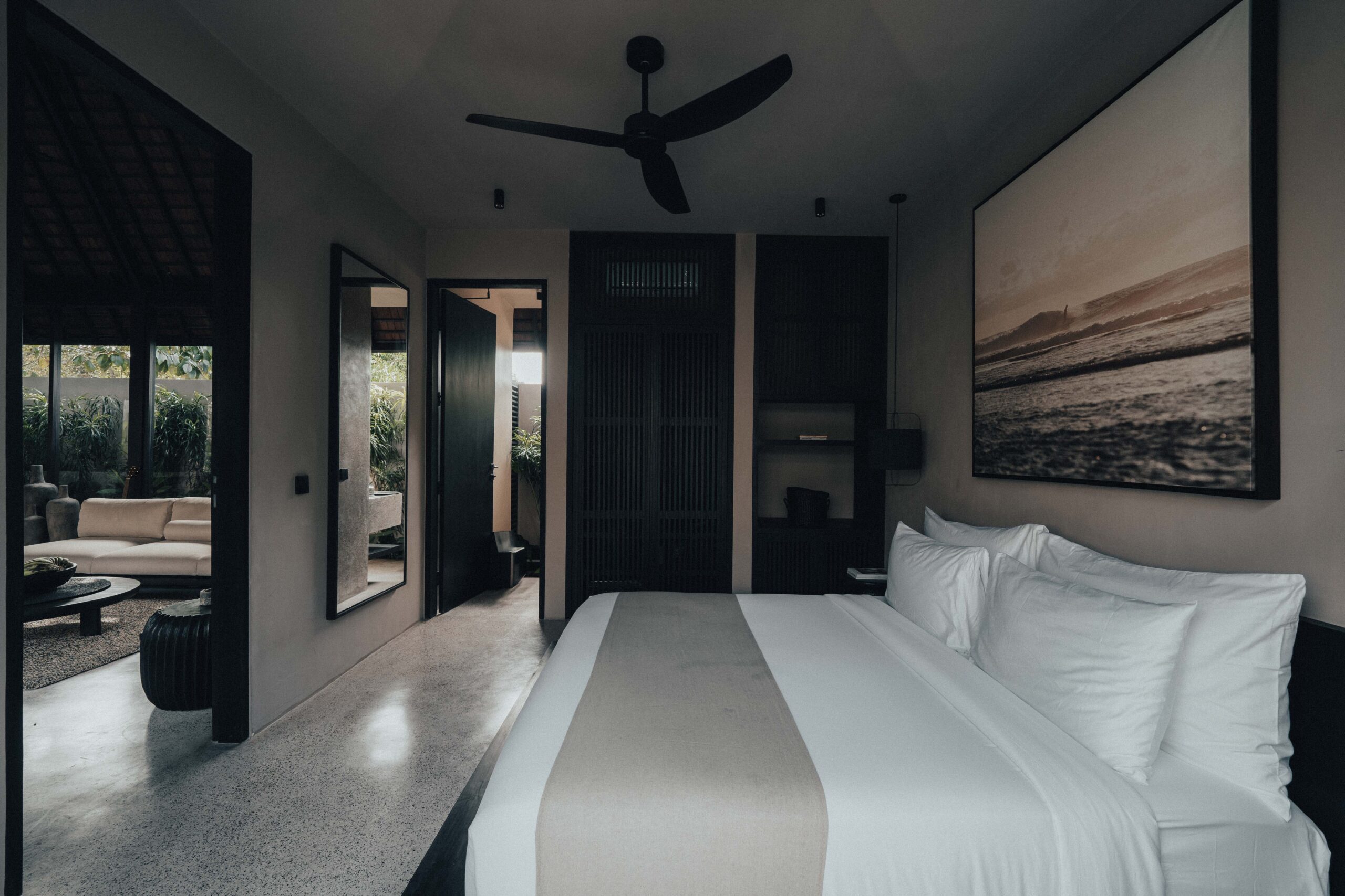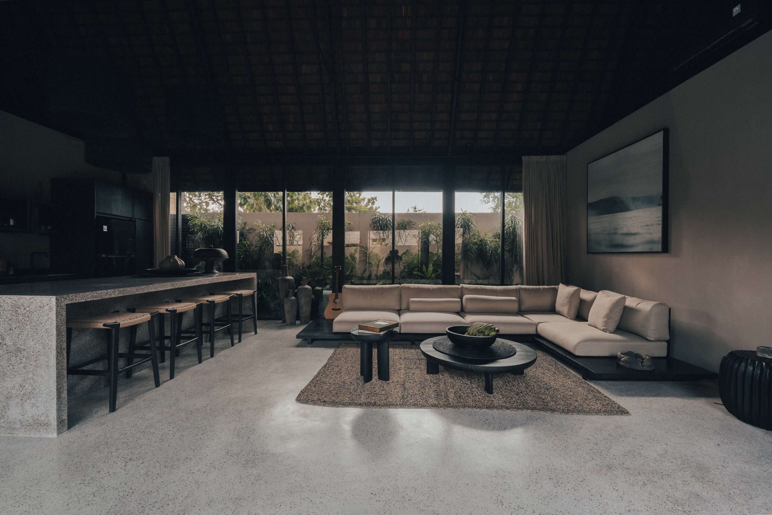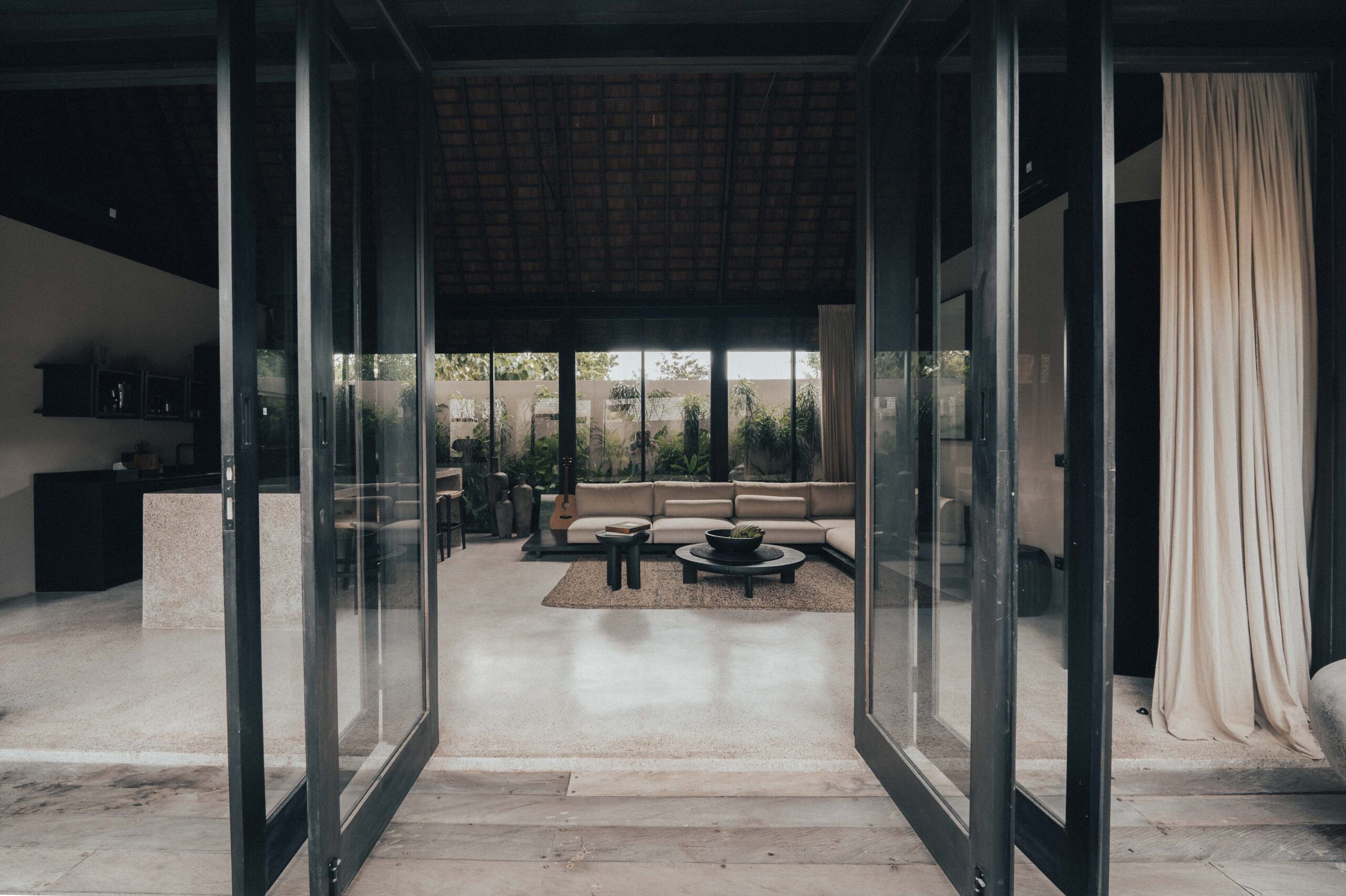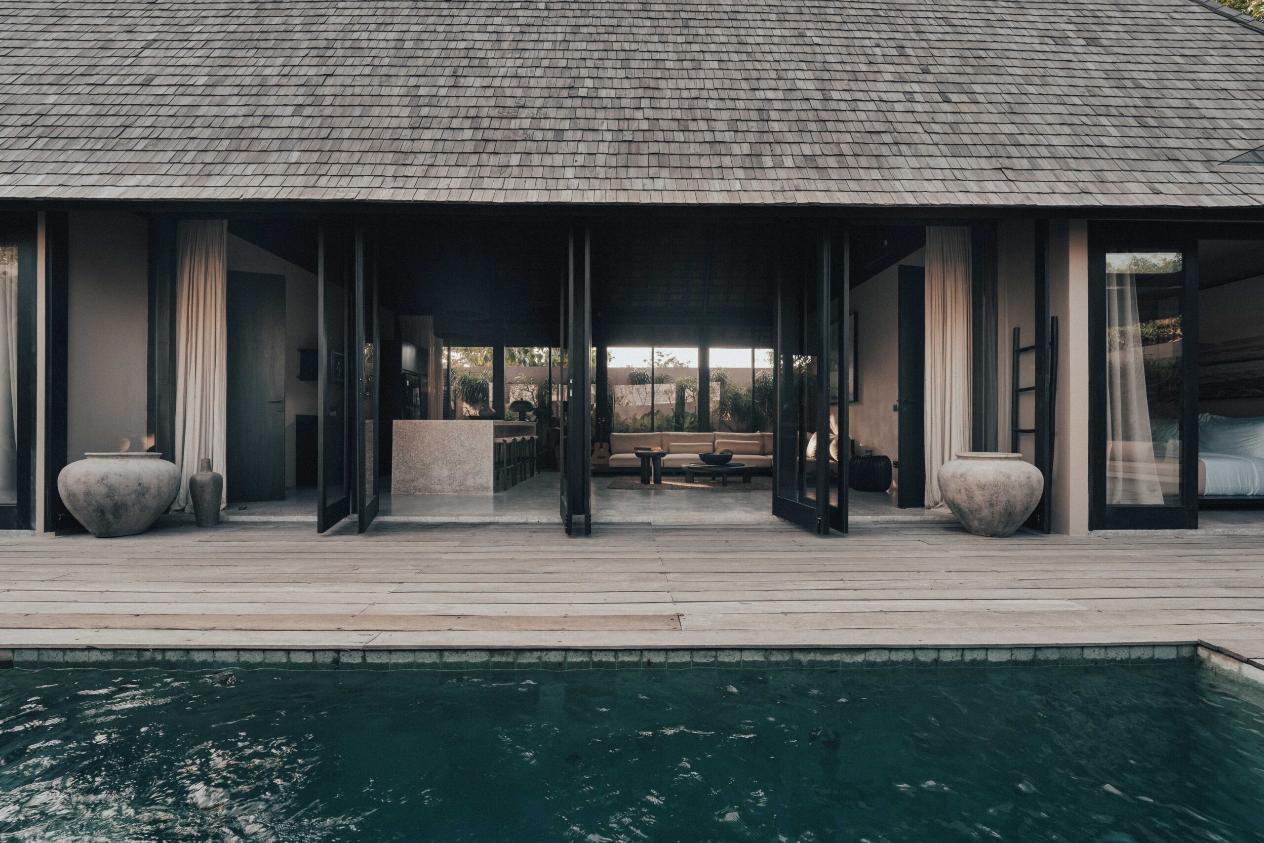 The One Bedroom Villa is designed for a slower, more self-contained stay. An open living area flows into a fully equipped kitchen, creating space for mornings that start unhurried and evenings that settle naturally. The bedroom connects to a semi-indoor bathroom filled with greenery and natural daylight, keeping the boundary between inside and outside soft and unforced. Outdoors, a private pool, sun loungers, and a shaded umbrella offer a quiet place to rest, read, or let the day pass — without needing to leave the villa at all.